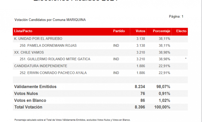 En Mariquina por 72 votos Rolando Mitre se impuso en la Votación de Alcaldes. Candidatos por Comuna MARIQUINA 65 mesas escrutadas de un total de 65, correspondiente al 100,00%.