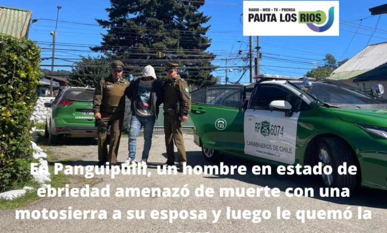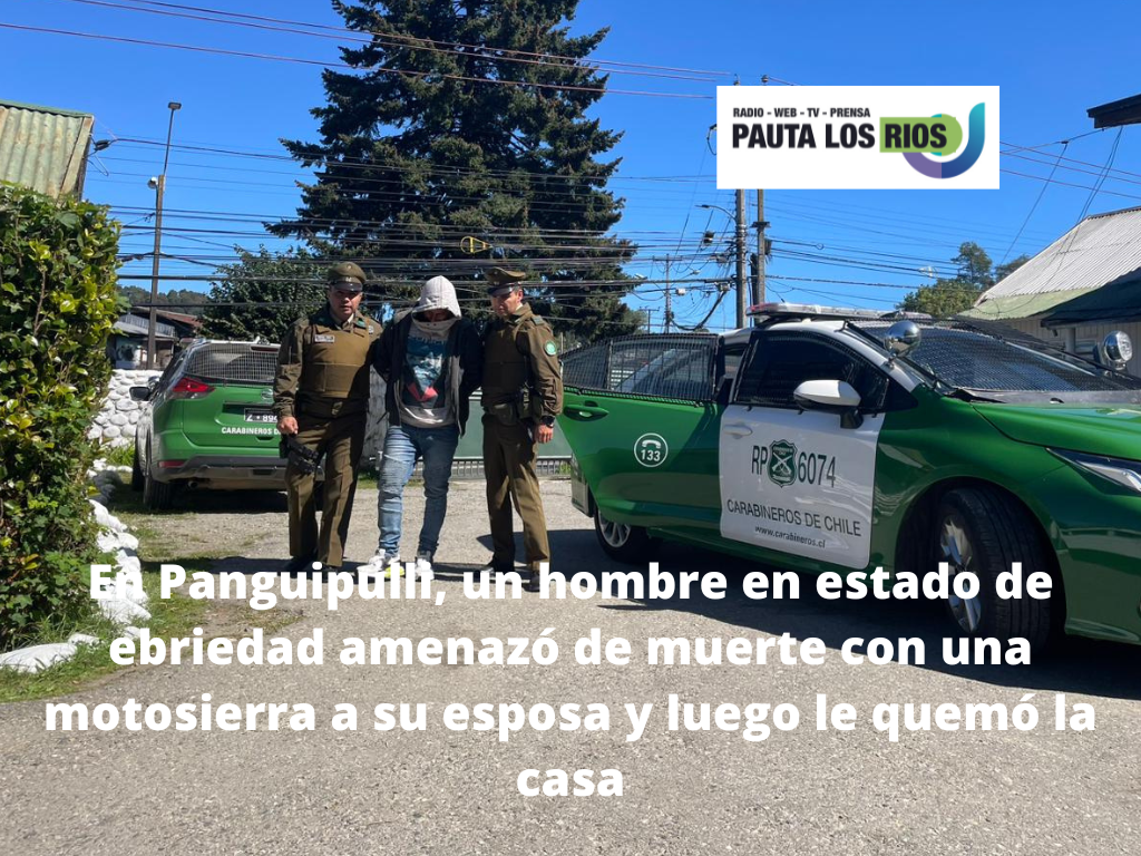 En Panguipulli, un hombre en estado de ebriedad amenazó de muerte con una motosierra a su esposa y luego le quemó la casa. Está detenido por incendio y amenazas en VIF, pasa a control al mediodía. Las primeras diligencias fueron instruidas también por el fiscal de turno Carlos Silva.
