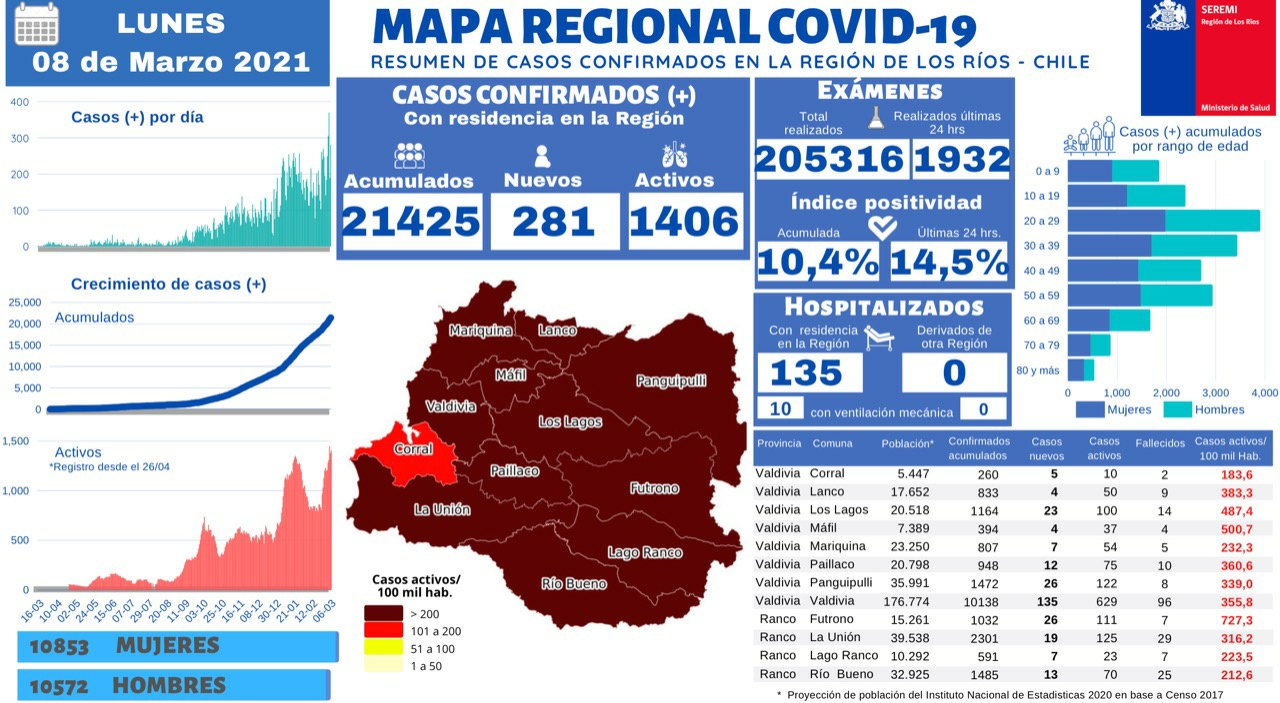 HOY!! En informe regional #Covid_19 de #LosRíos se informan 285 exámenes positivos, de ellos, 4 casos tienen residencia en las regiones de #Araucanía y la Región Metropolitana, en tanto, 281 corresponden a residentes de #LosRíos.