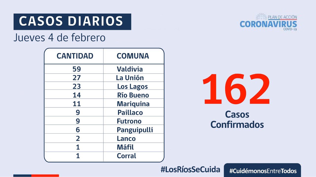 En Pautalosrios.cl: Reporte del Minsal 162 nuevos casos de Covid , en 1328 exámenes informados , 12% de positividad las últimas 24 horas , en la region se reportan 6 nuevos fallecidos .