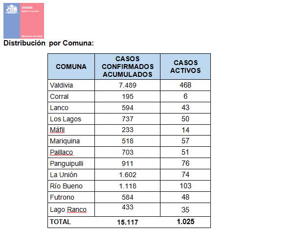 De esta manera, la Región de Los Ríos a la fecha mantiene 1.025 casos activos por residencia.