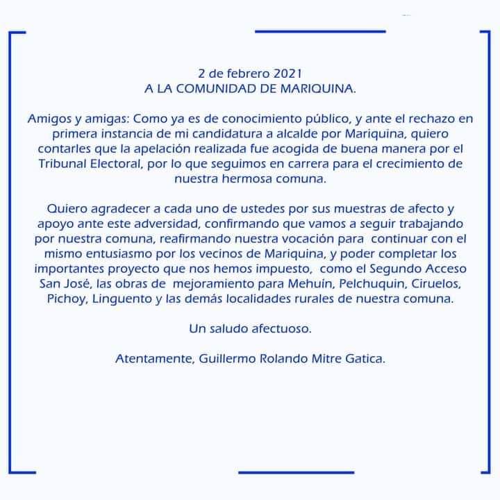 Rolando Mitre, a través de Redes sociales informó que el Tribunal Electoral confirmó la candidatura para la reelección de alcalde para la comuna, de esta manera la competencia electoral en Mariquina será entre Rolando Mitre, Erwin Pacheco y la actual funcionaria municipal Pamela Dornemann Rojas.