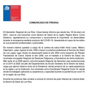 En PautalosRios.clRadio: ULTIMAHORA Gobierno Regional confirma que Seremi de Salud de Los Ríos, Regina Barra, deja su cargo a contar de hoy sábado 30 de enero de 2021.