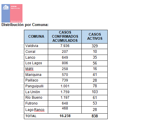 De esta manera, la Región de Los Ríos a la fecha mantiene 838 casos activos por residencia.