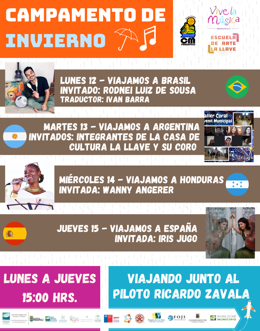 El Campamento de Invierno del Programa Vive la Música se realizará entre el lunes 12 y el jueves 15 de julio, a partir de las 15:00 horas, con invitados internacionales de Brasil, Honduras, Argentina y España. La versión de este año se centrará en un viaje musical con juegos, concursos, música, arte y cultura en alianza con la Escuela Municipal de Arte la Llave de Bariloche.