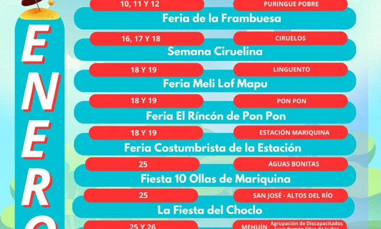 Durante Enero, podrán disfrutar de ferias gastronómicas en diferentes sectores de la comuna, ofreciendo una variedad de platos típicos y delicias locales. Descubre lo que los vecinos de Tralcao, Puringue Pobre, Ciruelos, Linguento, Pon Pon, Estación Mariquina, Aguas Bonitas, Altos del Río, Mehuín, Cuyinhue y Rucaco; han preparado para esta temporada.