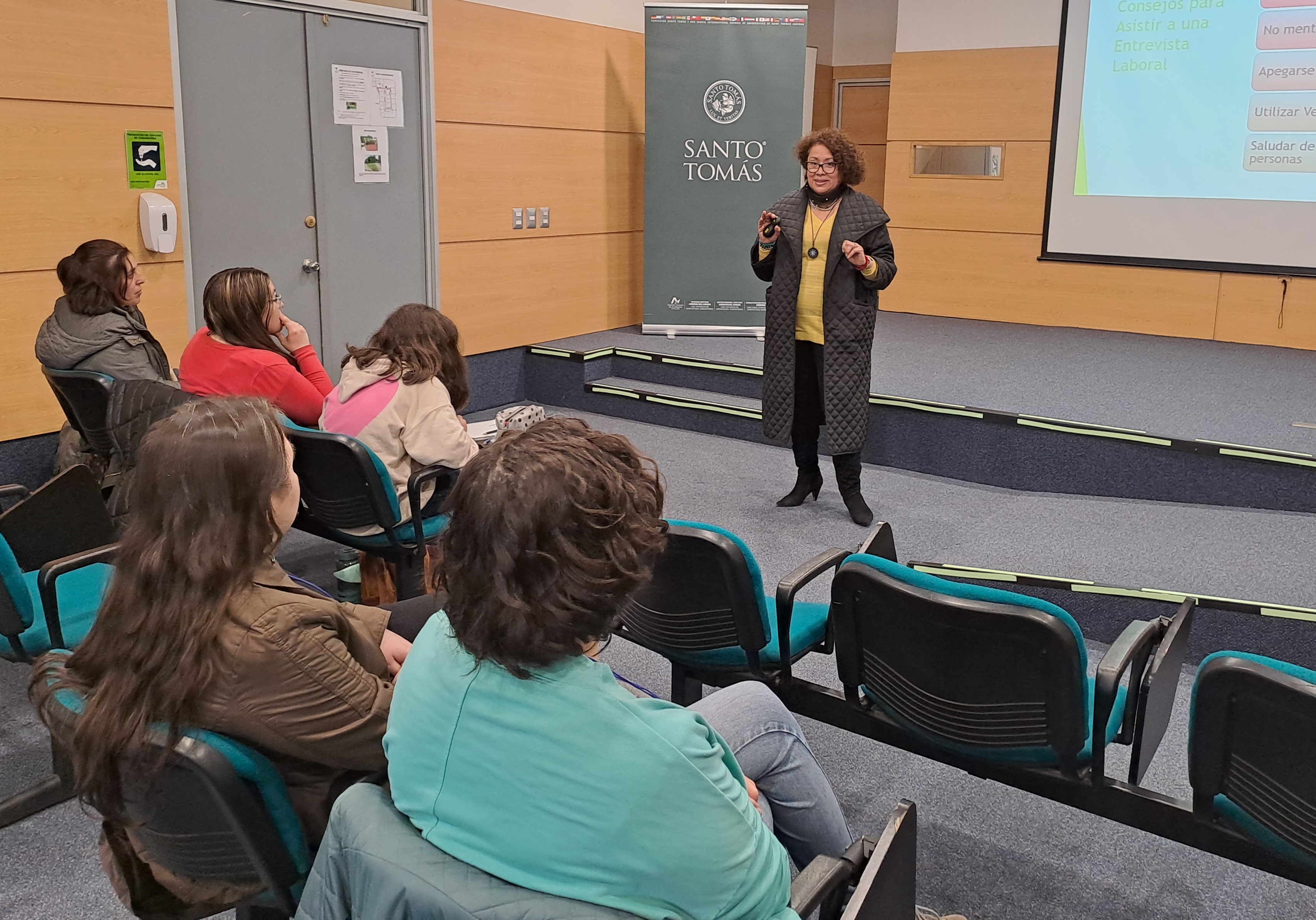Mariana Gavilán, psicóloga y tutora del Centro de Aprendizaje de la Santo Tomás, “mi charla estuvo enfocada en cómo dar una mejor entrevista y cómo los jóvenes pueden vender su imagen para tener una buena recepción en el empleador. Buscamos que puedan hacer un buen currículum, demostrando las competencias que adquirieron en sus carreras fortaleciendo el sello de la Santo Tomás que es el trabajo con las personas”, dijo.