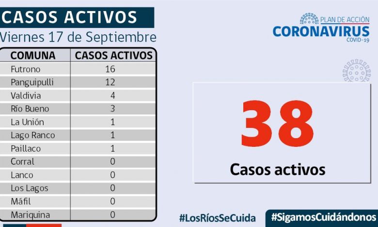 A la fecha en Los Ríos hay 38 casos activos, de los cuales 16 corresponden a la comuna de Futrono y 12 a la comuna de Panguipulli.