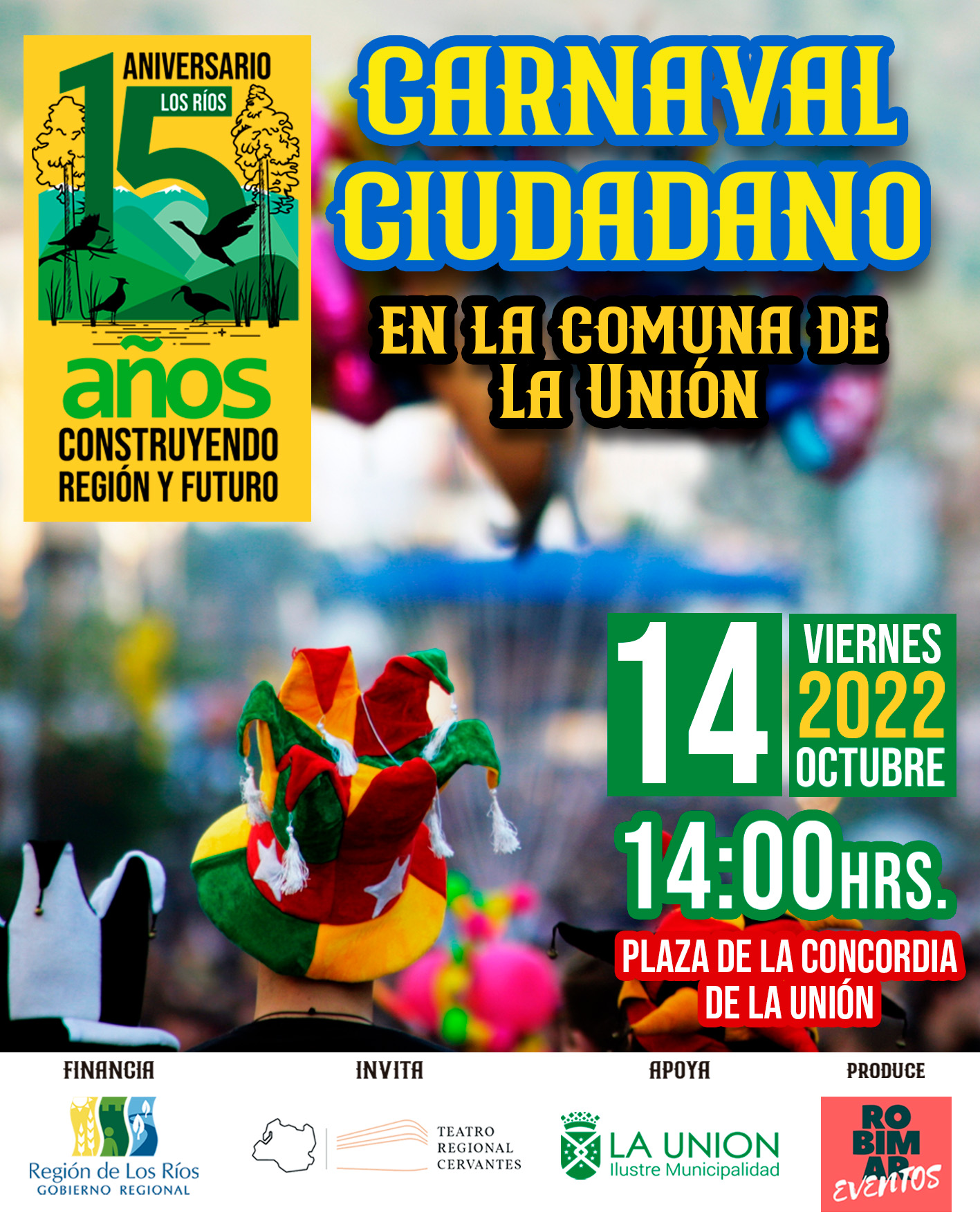 El Gobierno Regional de Los Ríos extiende la invitación a participar del Carnaval Ciudadano desarrollado en la comuna de La Unión, mañana viernes 14 de octubre desde las 14 horas, en la Plaza de la Concordia. La actividad se enmarca en el programa de aniversario de los 15 años de la región de Los Ríos.