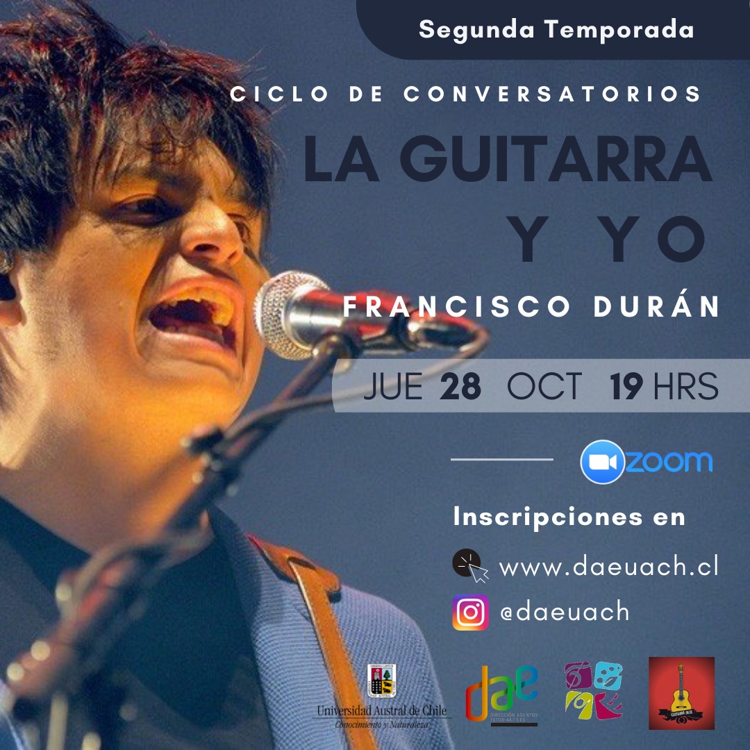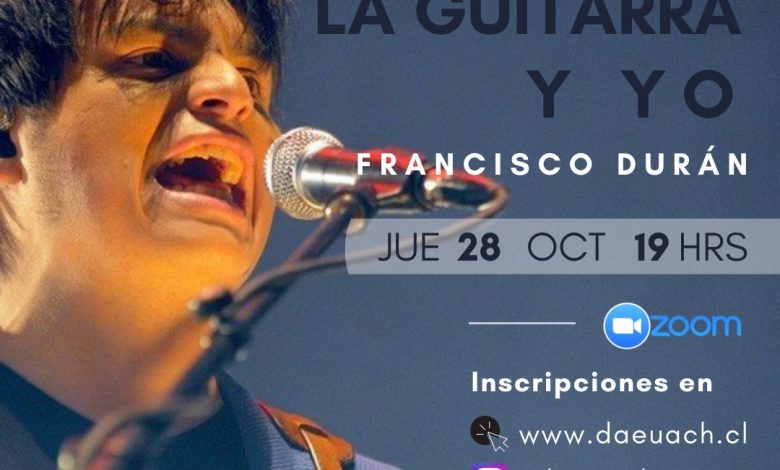 Francisco Durán es uno de los participantes de la segunda versión de conversatorios «La Guitarra y Yo», espacio producido por el Taller de Guitarra y Cordófonos de la Dirección de Asuntos Estudiantiles de la UACh, creado y dictado por el profesor Javier Cifuentes.