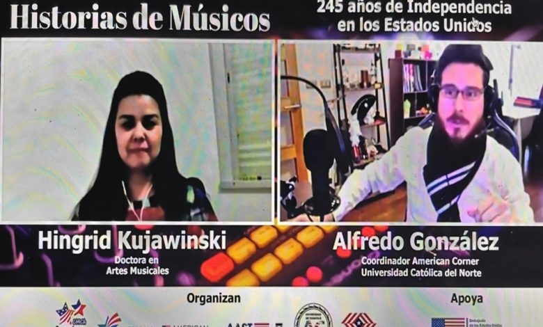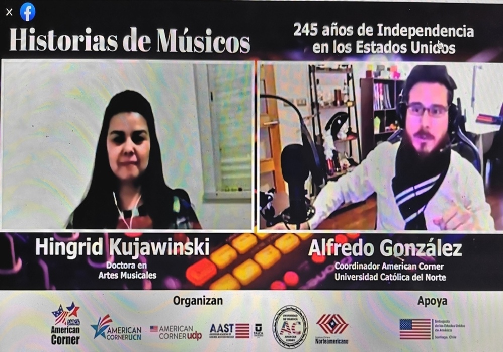 Una conversación amena y cargada de experiencias en el ámbito personal, profesional y musical sostuvieron tres artistas, de renombre nacional e internacional, con coordinadores de American Corner de las universidades Católica del Norte y Diego Portales, Alfredo González y Valentina Alfaro, respectivamente, en el marco del ciclo de entrevistas y sesiones, que se realizaron el pasado 13, 14 y 15 de julio, para conmemorar los 245 años de la Independencia de los Estados Unidos.