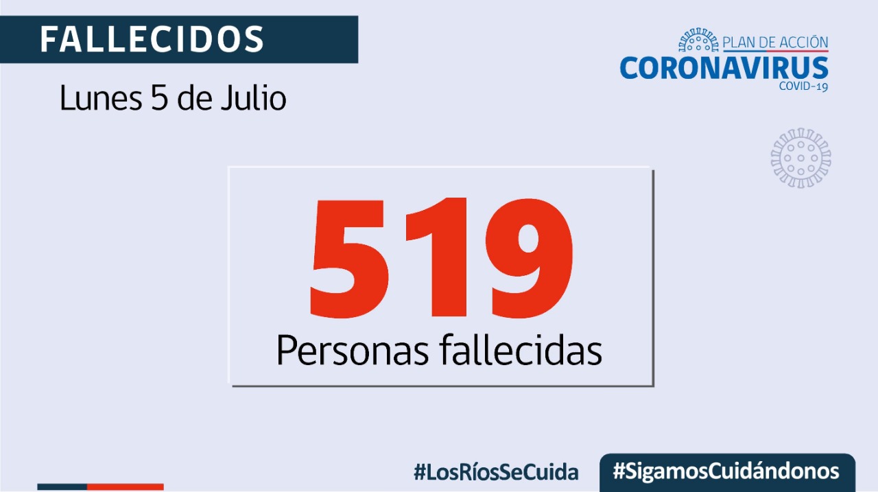 En esta jornada , se informó el lamentable deceso de 3 personas de las comunas de Paillaco y Valdivia, total de fallecidos 519 en los Rios.