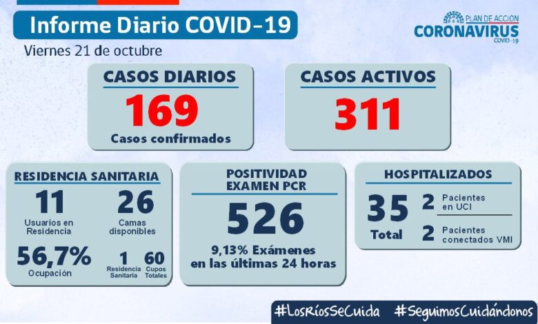 La Secretaría Regional Ministerial de Salud Los Ríos informó que 169 exámenes resultaron positivos para SARS-CoV-2. De dicho total, 48 se diagnosticaron mediante test PCR y 121 fueron pesquisados con test de antígeno.