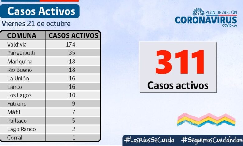 A la fecha, hay 311 casos activos, de los cuales 174 corresponden a la comuna de Valdivia y 35 a la comuna de Panguipulli.