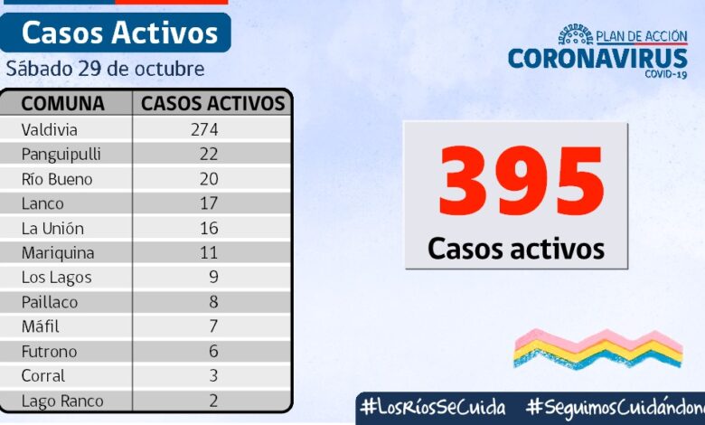 A la fecha, hay 395 casos activos, de los cuales 274 corresponden a la comuna de Valdivia y 22 a la comuna de Panguipulli.