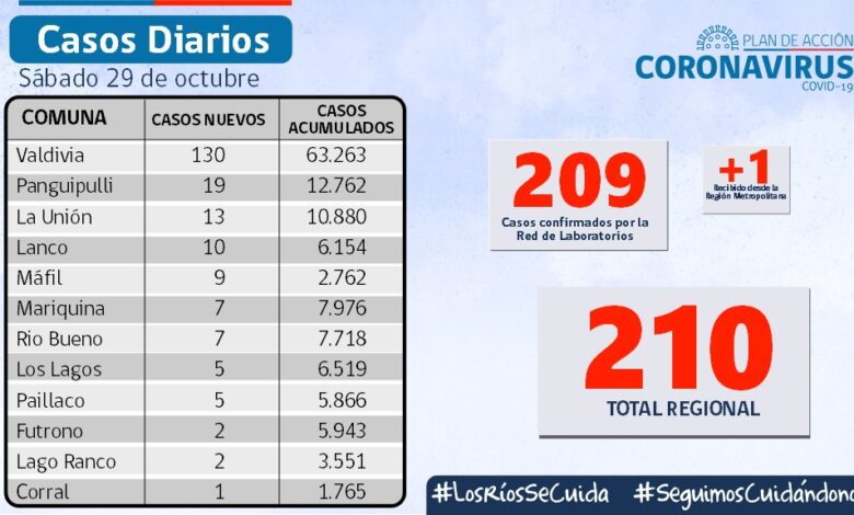 REPORTE] La SEREMI de Salud, informó que hoy se reportaron 210 nuevos casos de COVID-19 en Los Ríos.
