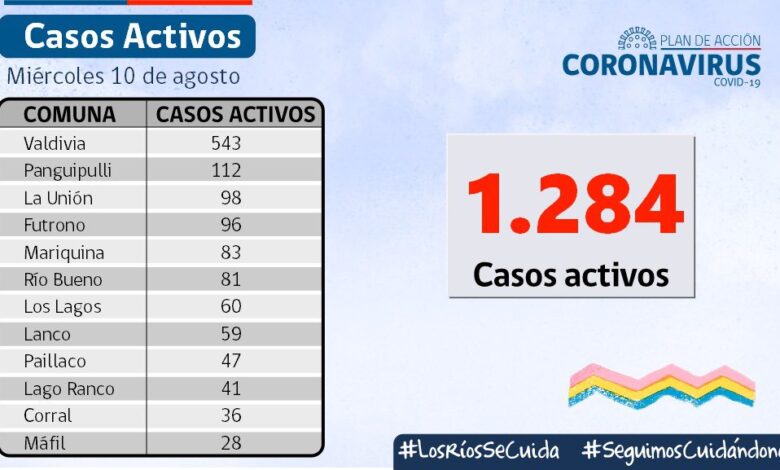 A la fecha, hay 1.284 casos activos, de los cuales 543 corresponden a la comuna de Valdivia y 112 a la comuna de Panguipulli.