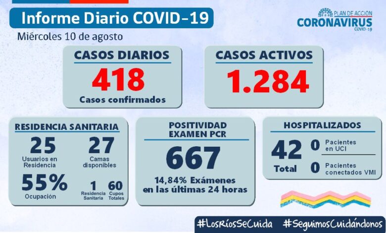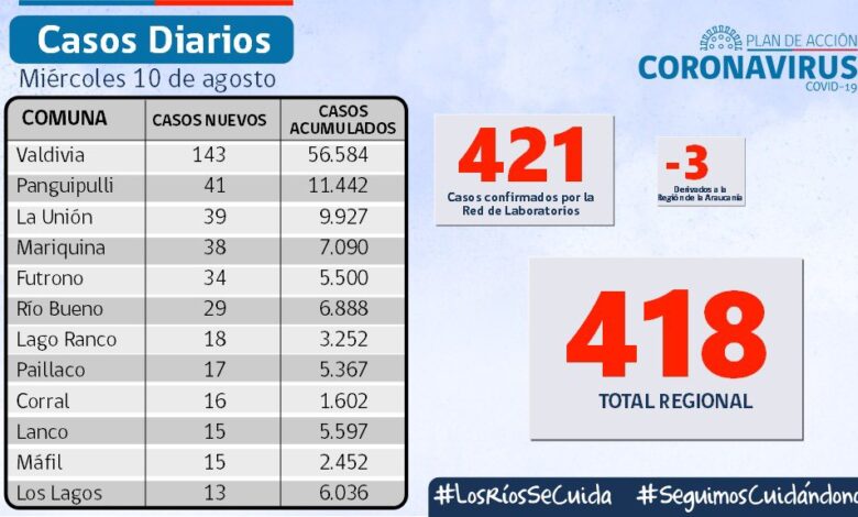 La Secretaría Regional Ministerial de Salud Los Ríos informó que 421 exámenes resultaron positivos para SARS-CoV-2. Adicionalmente, se derivaron 3 casos a la Región de la Araucanía, por lo que hoy, se informan 418 nuevos casos de Covid-19 en Los Ríos. Del total, 98 se diagnosticaron mediante test PCR y 320 fueron pesquisados con test de antígeno.
