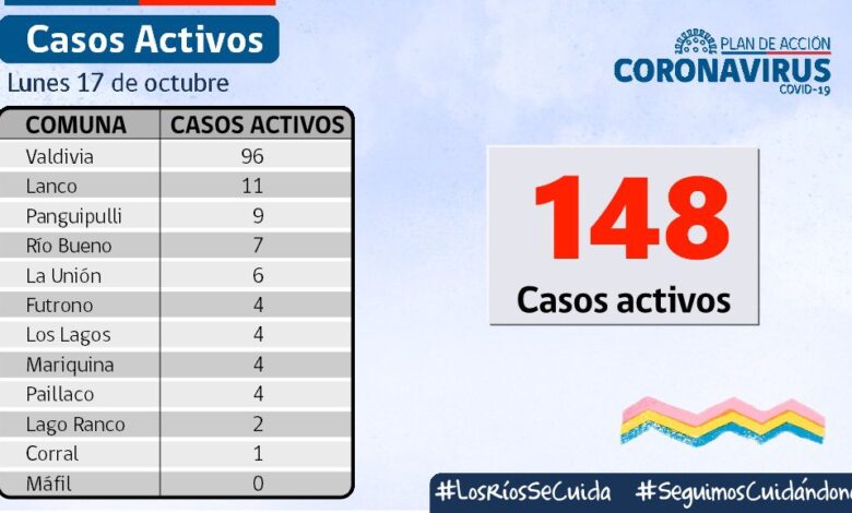 A la fecha, hay 148 casos activos, de los cuales 96 corresponden a la comuna de Valdivia y 11 a la comuna de Lanco.