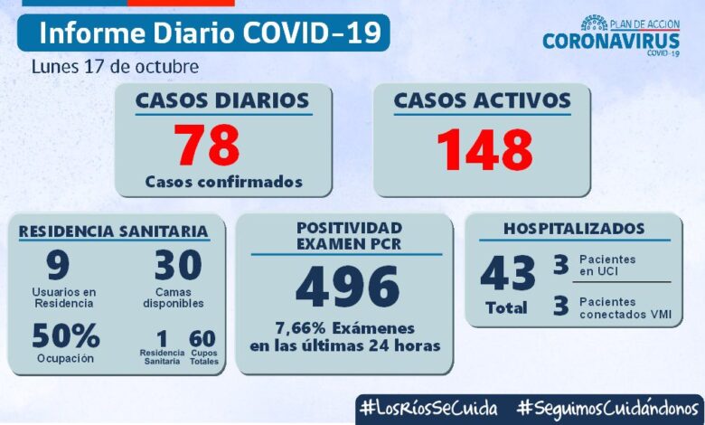 Hoy se reportaron en los Ríos 78 contagios nuevos y se informa de tres personas fallecidas por causas asociadas al Covid-19