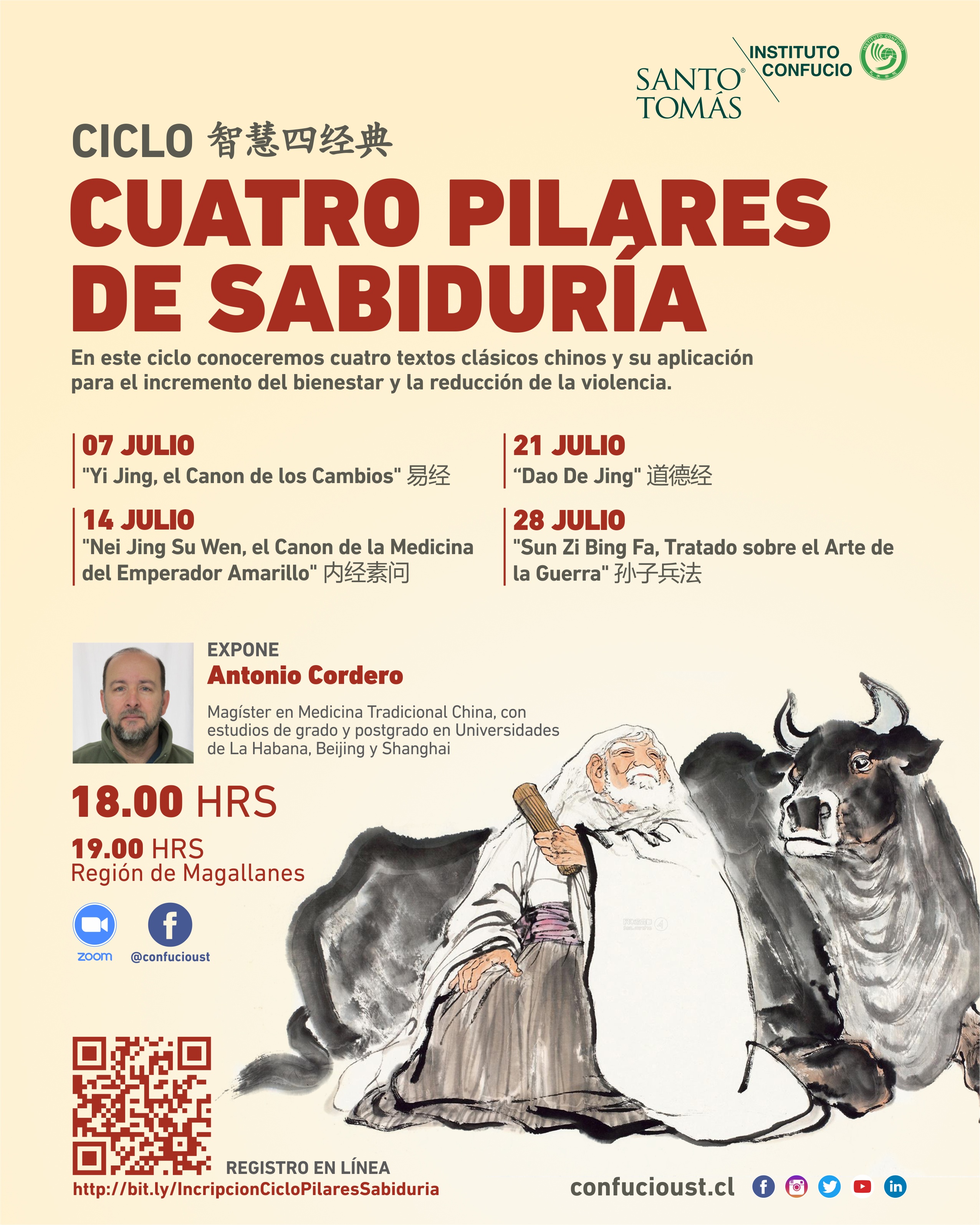 Este ciclo estará a cargo de Antonio Cordero, Magíster en Medicina Tradicional China con estudios en las Universidades de La Habana, Beijing y Shanghai; además dirige varias instituciones relacionadas con el área del bienestar a través de estas disciplinas del gigante asiático. La cita será a las 18 horas y se podrá tener acceso a estos Webinar a través de sesiones en vivo de Facebook Confucioust además de la plataforma ZOOM, a la que se pueden inscribir a través del enlace http://bit.ly/IncripcionCicloPilaresSabiduria