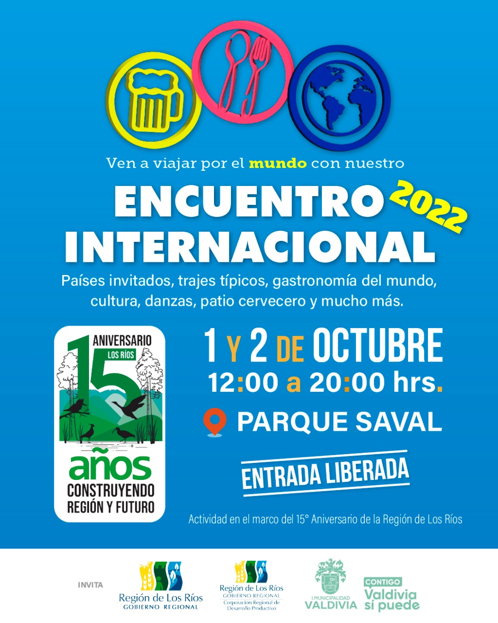 El Gobierno Regional de Los Ríos, la Corporación de Desarrollo Productivo y la Ilustre Municipalidad de Valdivia, invitan a toda la comunidad residente y a quienes se encuentren de visita en las provincias de Valdivia y El Ranco al Primer Encuentro Internacional que se celebrará este próximo sábado 01 y domingo 02 de octubre en el Centro de Ferias del Parque Saval de la capital regional, actividad que es parte de la parrilla programática de la celebración de los quince años de la región de Los Ríos.