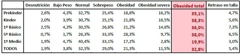 En primero básico, la prevalencia de sobrepeso es de 26.8%, en obesidad de 21.2% y obesidad severa 14.8%. En quinto básico, se aprecia un aumento de sobrepeso con un 33.3%, de 28.3% y disminuye la obesidad severa con 9.72%. En primero medio, el sobrepeso alcanza el 33.1%, la obesidad 17.2% y la obesidad severa un 2.8%.