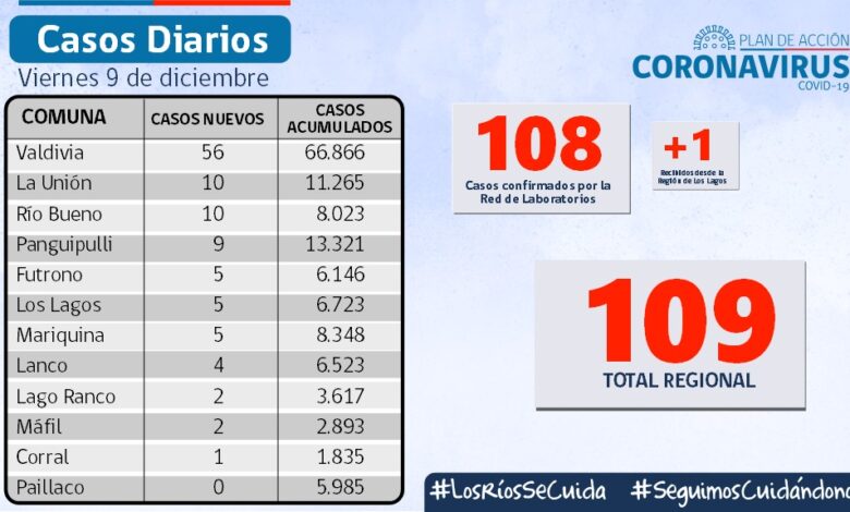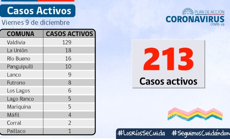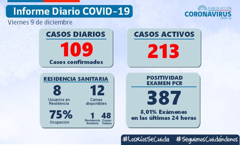 La autoridad sanitaria informó 109 contagios nuevos , 213 casos activos y a la fecha 1.130 personas fallecidas por causas asociadas al Covid,19 en los Ríos