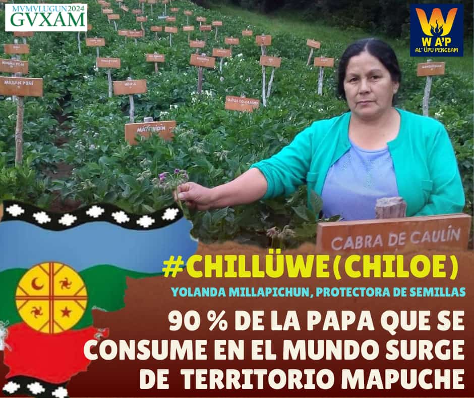 Las poñi(Papas) como alimento recibido generosamente desde la ñuke mapu multiplicado en una armónica sociedad laboral hace reproducir semillas que llevó al investigador de la Universidad Austral Andrés Contreras a afirmar que el 90% de la papa consumida en el planeta surge desde Wallmapu específicamente en la Isla de Chiloe y donde además se destaca la presencia de una guardadora de semillas como la l’amuen Yolanda Millapichun que en sus jardines de Raimilla cuida, protege y reproduce más de 100 variadas distintas.