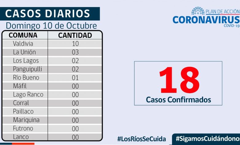 El SEREMI de Salud(S), Leonardo Bórquez, informó que hoy se reportaron 18 nuevos casos de COVID-19 en Los Ríos, A la fecha en Los Ríos hay 72 casos activos, de los cuales 35 corresponden a la comuna de Valdivia y 14 a la comuna de LosLagos, Durante esta jornada se informó el procesamiento de 1.111 exámenes, con una positividad de 1,1% en Residencias Sanitarias se mantienen 39 usuarios, lo que representa un 42,5% de ocupación de camas.