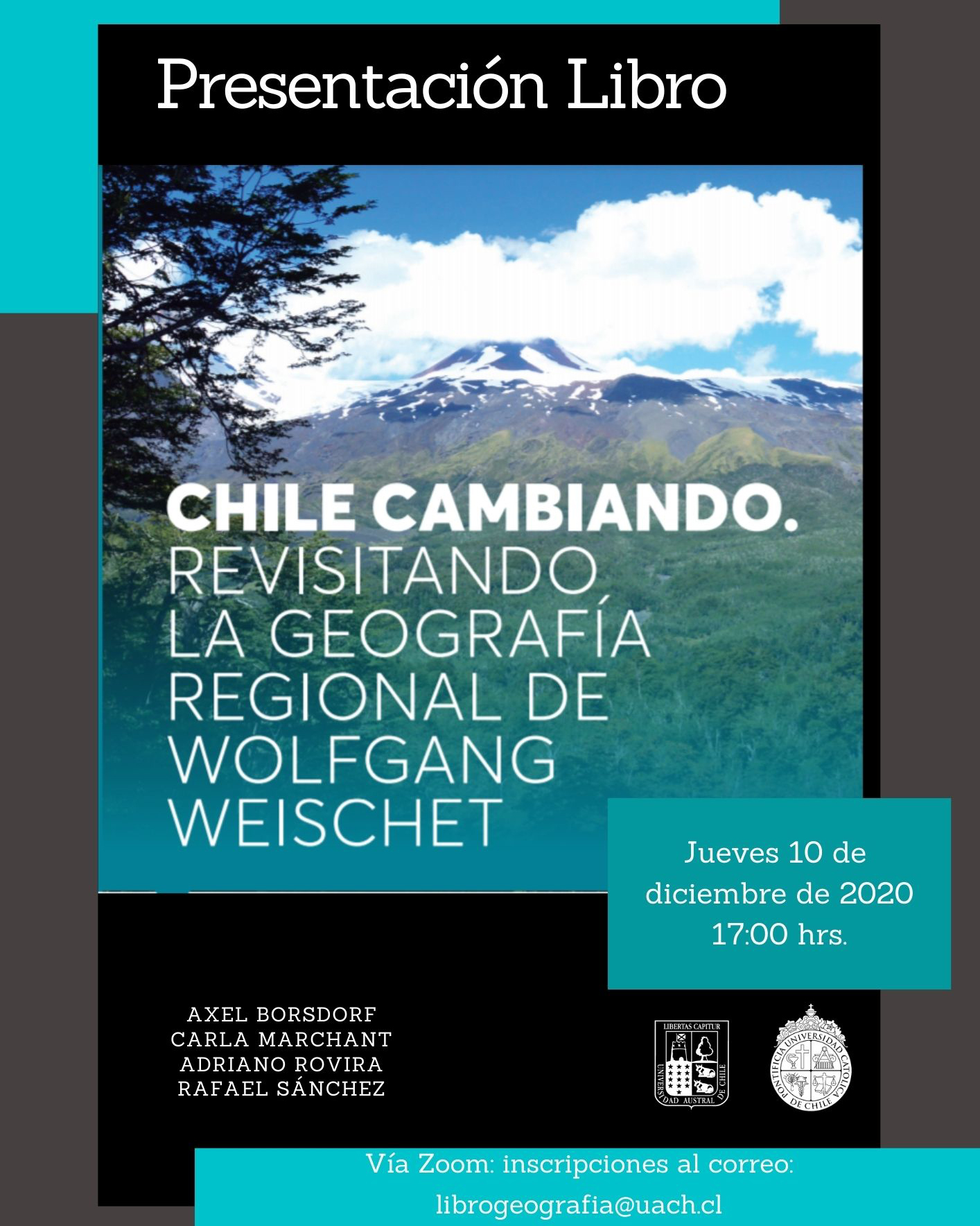 Este es el patrimonio que hoy sirve de contexto para el lanzamiento del texto: «Chile cambiando: Revisitando la geografía regional de Wolfgang Weischet». Evento que se llevará a cabo el próximo jueves 10 de diciembre a las 17:00 horas, de forma online cuyas inscripciones se pueden realizar en el correo electrónico: librogeografía@uach.cl o también se podrá seguir a través del facebook de la Escuela de Geografía UACh (click aquí). https://www.facebook.com/geouach