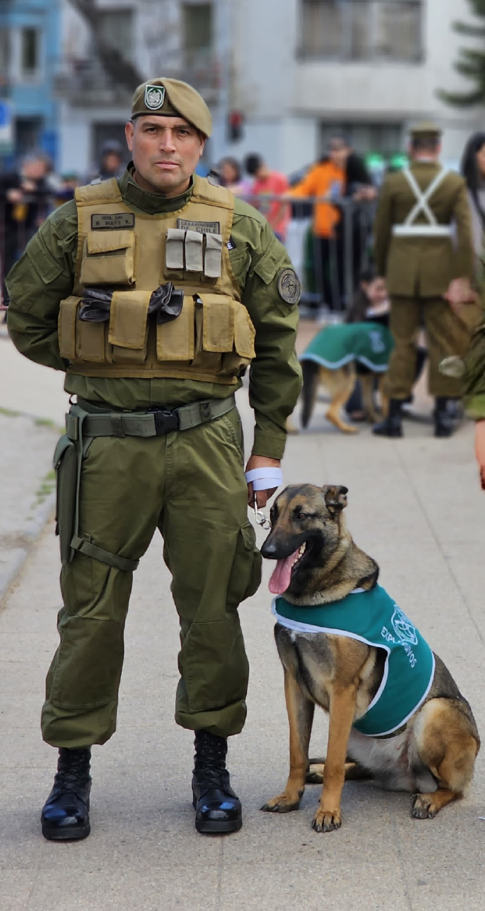 Junto con la ejemplar de dos años de raza pastor belga con pastor ovejero, llegó también su instructor, el Sargento 2° Héctor Maya Rivadeneira, quien entrena a Katrina desde sus dos meses de vida en la Escuela de Adiestramiento Canino de Carabineros.