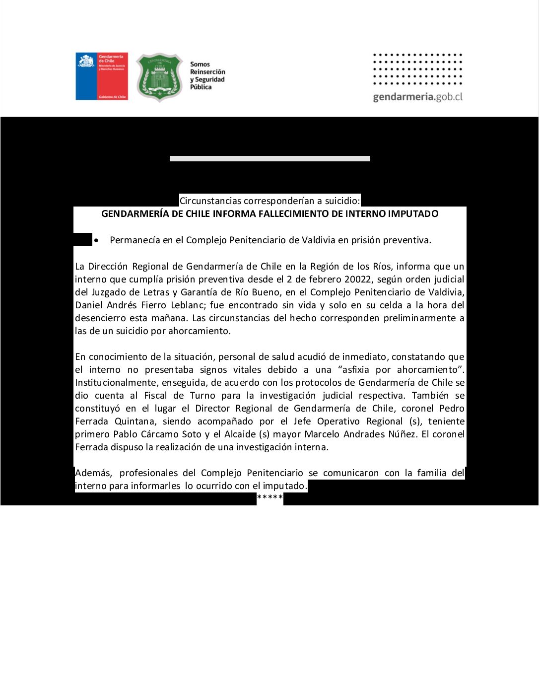 La Dirección Regional de Gendarmería de Chile en la Región de los Ríos, informa que un