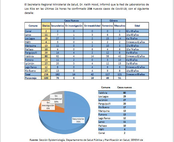 De los 238 casos confirmados por residencia en Los Ríos, 182 corresponden a casos secundarios, 42 aún están sin trazabilidad y 14 se encuentran en investigación. En tanto, a la fecha, la región presenta 37.184 casos acumulados, de los cuales 1.063 corresponden a casos activos, 35.737 a personas recuperadas y 384 a fallecidos.