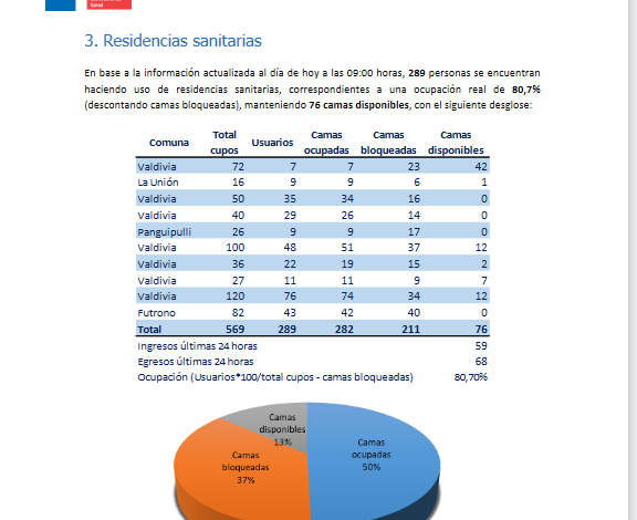 Respecto a las Residencias Sanitarias, a la fecha, 289 personas están haciendo uso de estos espacios de aislamiento, lo que representa una ocupación real del 80,7%. En ese sentido, de las 569 camas en total, 282 están ocupadas y 76 camas están disponibles.