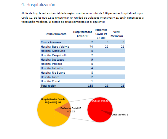 En cuanto a las hospitalizaciones, 118 pacientes se mantienen internados en distintos recintos asistenciales de la región, de los cuales 22 se encuentran en la Unidad de Cuidados Intensivos (UCI) y 21 de ellos, están conectados a ventilación mecánica.