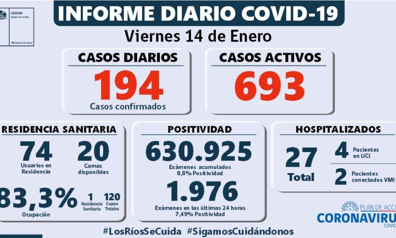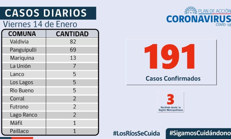 La Secretaría Regional Ministerial de Salud notificó 191 exámenes positivos para SARS-CoV-2 recibidos desde la Red de Laboratorios de Los Ríos. Adicionalmente se reciben tres casos confirmados desde la Región Metropolitana, por lo tanto, hoy se informan un total de 194 casos nuevos de Covid-19 en la región.