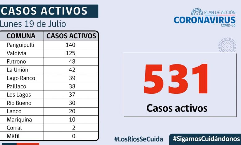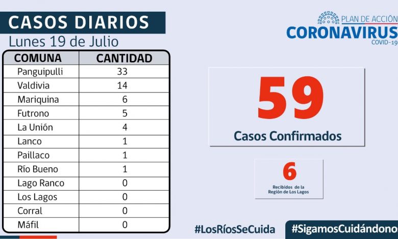 La Secretaría Regional Ministerial de Salud notificó 59 exámenes positivos para SARS-CoV-2 recibidos desde la Red de Laboratorios de Los Ríos. Adicionalmente, se recibieron 6 casos desde la región de Los Lagos. Es así que el total regional de casos nuevos en Los Ríos es de 65.