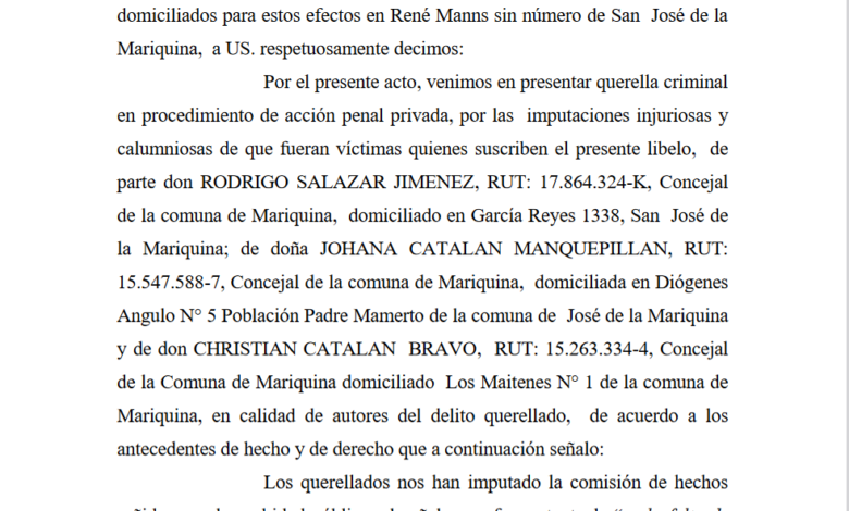 Una querella por el delito de injurias y calumnias graves presentaron 16 funcionarios del Cesfam de Mariquina, en contra de los Concejales en ejercicio Rodrigo Salazar, Cristian Catalán y Yohana Catalán.