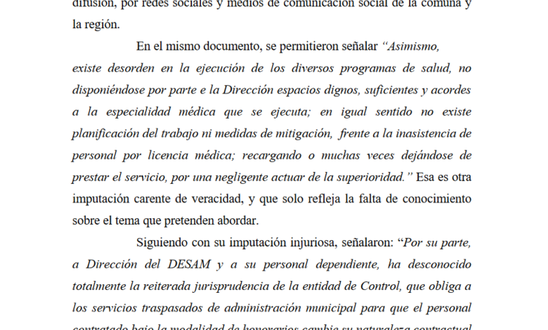 La presentación respectiva a la que se hace mención, por parte de los funcionarios ante el ente Contralor fue presentada en el oficio N°01/2023 de fecha 07 de Junio del mismo año, dirigido al Contralor de los Ríos , dando a entender que la divulgación de esa presentación se hizo masiva a través de redes sociales y medios de comunicación de la comuna de Mariquina y la región. En esta oportunidad también y dentro del mismo documento presentado al ente Contralor los Concejales señalan que » Existe desorden en la ejecución de los distintos programas de salud no disponiéndose por parte de la dirección de espacios dignos , suficientes y acordes a la especialidad médica que se ejecuta, no existiendo planificación del trabajo ni medidas de mitigación, frente a la inasistencia de personal por licencia médica , recargándose o muchas veces dejándose de prestar el servicio, por una negligente actuar de la superioridad » a juicio de los funcionarios denunciados esta imputación carente de veracidad y que solo refleja la falta de conocimiento sobre este tema y que fuera denunciado ante Contraloría por los Concejales , Rodrigo Salazar, Cristian Catalán y Yohana Catalán respectivamente.