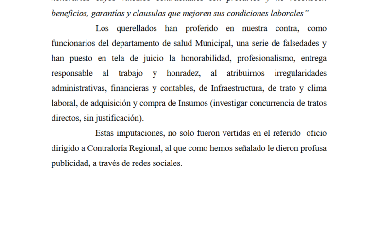 Los funcionarios de salud , en su presentación indicaron que es una acción penal privada por las imputaciones injuriosas y calumniosas de la que fueron victimas, en este sentido mencionan que los Concejales en ejercicio antes mencionados, nos han imputado hechos reñidos con la probidad pública al señalar » La falta de protocolos , reglamentos y manuales que mejoren el ejercicio de la función pública , incondicionalmente a ello se visualiza el deficiente uso de los recursos fiscales y el desorden administrativo al interior de la entidad vinculado a todas las áreas , especialmente en el ámbito presupuestario y contable indicaron los funcionarios de salud Municipal.