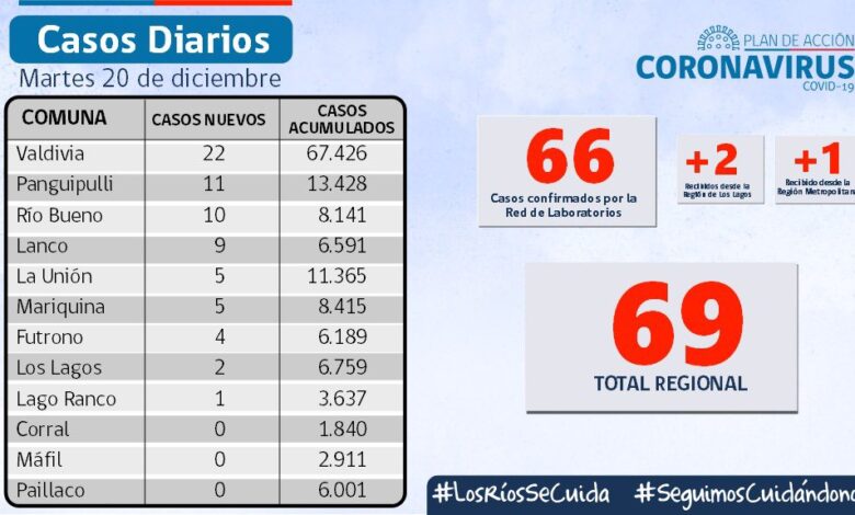 Más de 100 casos activos en los Ríos, en tanto hoy se reportaron 69 contagios nuevos.