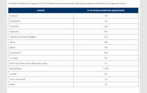 Al realizar el desglose por regiones, los 8.352 establecimientos educacionales adjudicados. LOS DETALLES EN EL SIGUIENTE LINK.