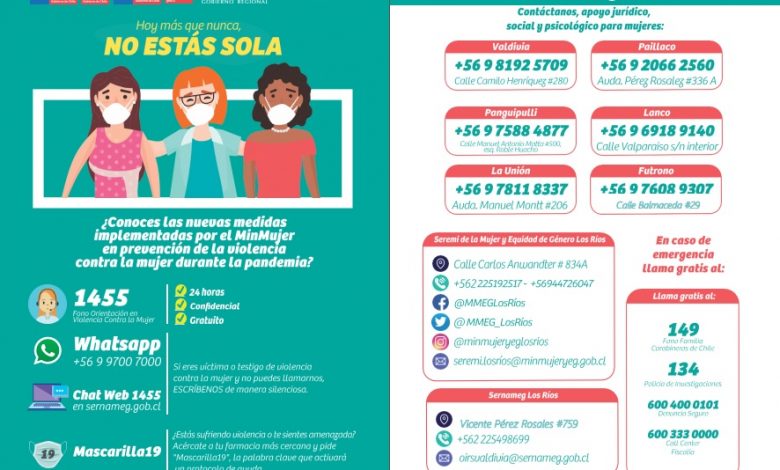 Al respecto la Directora Regional de SernamEG, Waleska Fehrmann Atero, señaló que “dentro de los canales silenciosos de orientación y ayuda implementados para hechos de violencia de género, contamos con el WhatsAPP +569 9700 7000 donde podrán comunicarse durante las 24 horas del día y los 7 días de la semana y recibir orientación por profesionales expertos en la materia. Así también con el Fono 1455 de SernamEG, un fono de orientación que funciona las 24 horas del día, es gratuito, y que se puede llamar desde teléfono fijo o celular para recibir orientación sobre qué es la violencia de género, qué hacer si estás viviendo violencia y dónde denunciar. También pueden acceder al Fono CHAT 1455 desde la página web www.sernameg.gob.cl. Ambos números son implementados por el Ministerio de la Mujer y el Servicio Nacional de la Mujer y la Equidad de Género para brindar orientación sin la necesidad de hablar por teléfono o salir del domicilio”, agregó la autoridad.