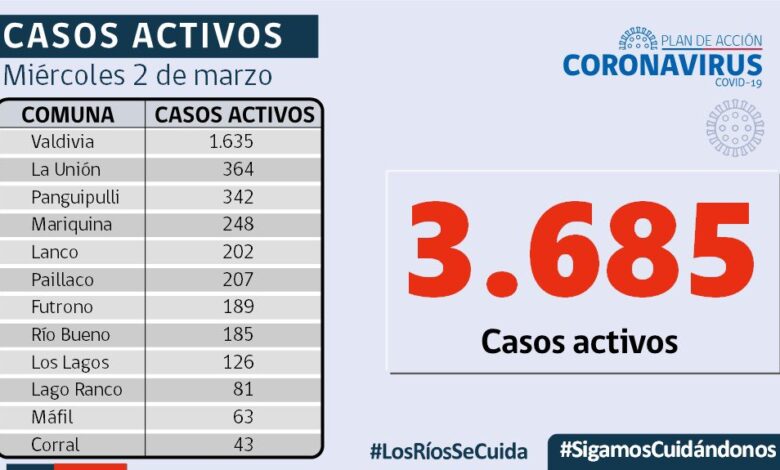 A la fecha, hay 3.685 casos activos, de los cuales 1.635 corresponden a la comuna de Valdivia y 364 a la comuna de La Unión.