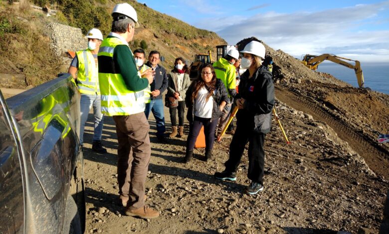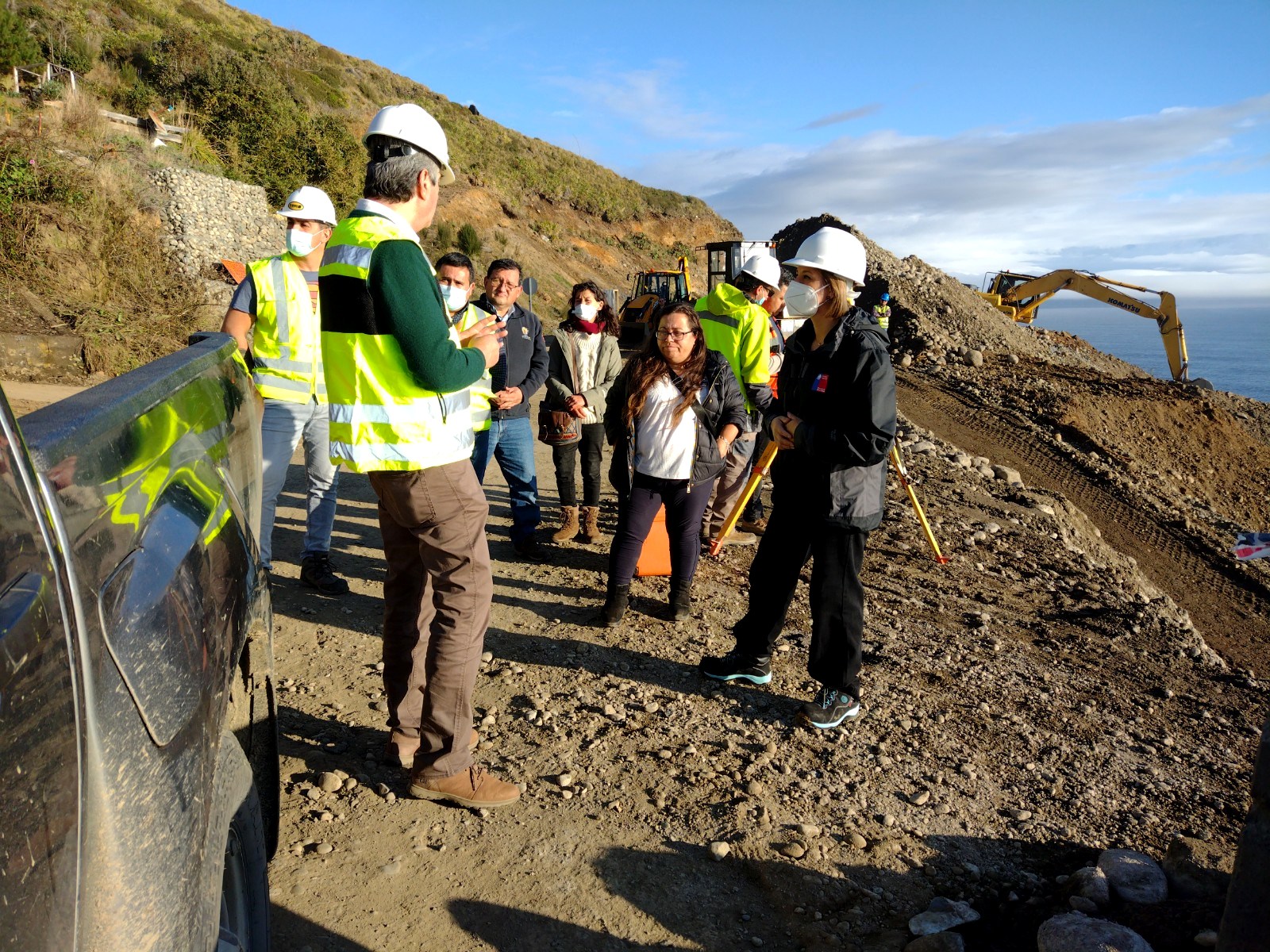 Seremi de Obras Públicas, Nuvia Peralta revisó los trabajos de reparación del socavón en la ruta costera junto a vecinos y dirigentes de la zona. Se construirán paraderos y se habilitará paso peatonal provisorio. Se espera reabrir tránsito a fines de mayo.