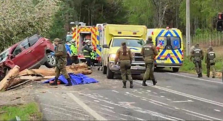 Parte Policial del accidente de esta tarde en Panguipulli. A las 16:00 horas, en el Km 41 de la Ruta Ch-203, ocurrió un accidente de tránsito provocado por camión cargado con trozos, cuya carga se desprendió cayendo sobre vehículo Hyundai Sta Fe, patente HJCF 883, donde viajaban 3 personas, de las cuales dos quedaron con lesiones de carácter reservado y una tercera acompañante, mujer, falleció.