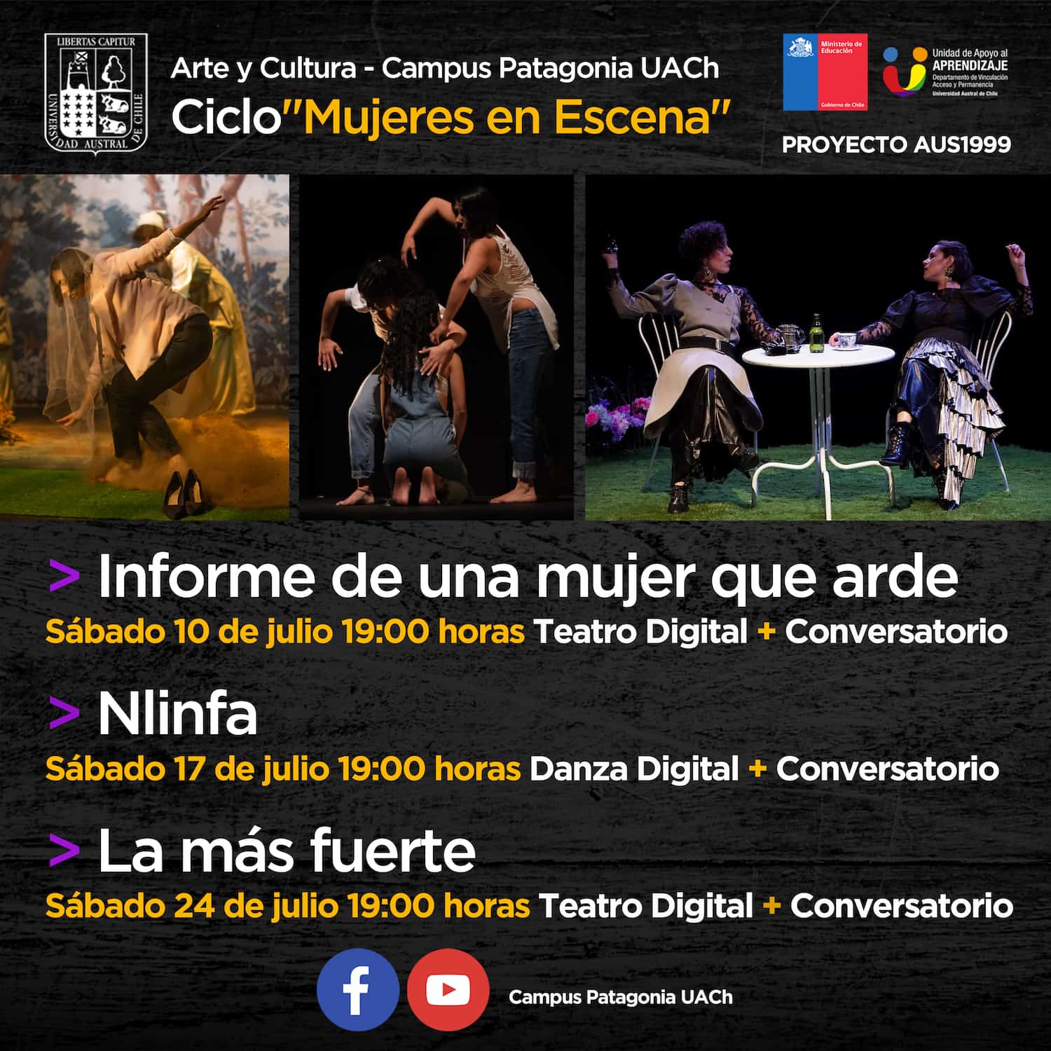 “Mujeres en escena” es el nombre que lleva este espacio que será transmitido vía Facebook Live y Canal de Youtube del Campus Patagonia UACh, los días sábado 10, 17 y 24 de julio a partir de las 19:00 horas, instancia que será moderada por las artistas regionales Sol Inzunza, Ivonne Lejonagoitia y Caro Soza.