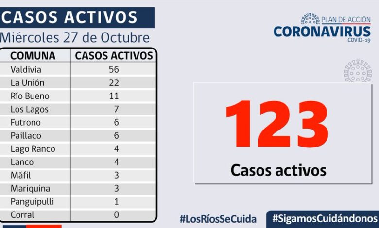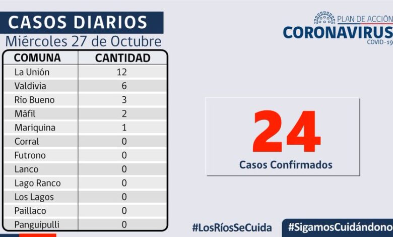 Nueva alza en los contagios por Covid-19 , en los Ríos casos confirmados 24 hoy Miercoles 27 de Octubre