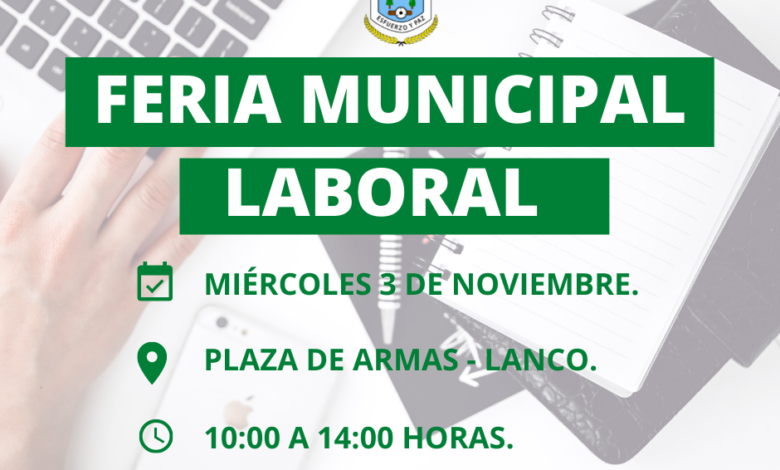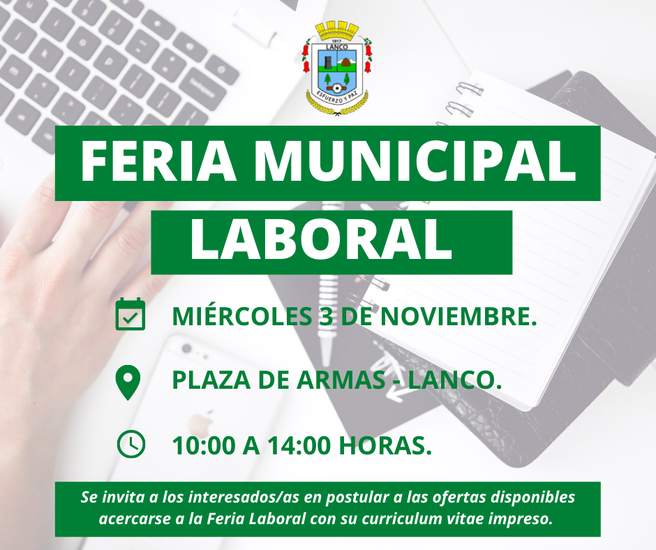 La Municipalidad de Lanco a través de su Oficina Municipal de Información Laboral (OMIL), realizará una inédita Feria Municipal Laboral Lanco 2021, que se llevará a cabo próximo miércoles 03 de noviembre, desde las 10:00 hasta las 14:00 horas, en la Plaza de Armas, ubicada en calle Libertad (Frente al municipalidad) en la ciudad de Lanco.